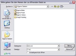 | Zeile 4 | Dateifilter für den Dialog, Beispiel: Text (*.txt) : *.txt : Bilder (*.bmp; *.ico) : *.bmp; *.ico | Dateifilter für den Dialog, Beispiel: Text (*.txt) : *.txt : Bilder (*.bmp; *.ico) : *.bmp; *.ico | - |