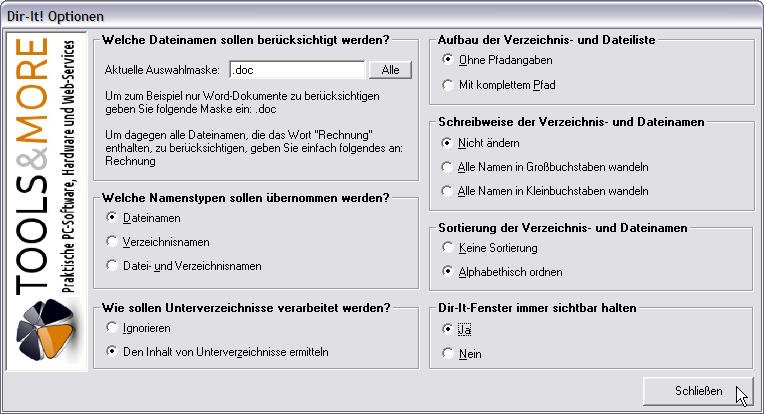 Mit dem Taster Optionen öffnen Sie den gleichnamigen Dialog. Dort können Sie u.a. einstellen, welche Namen und Namenstypen berücksichtigt werden sollen und wie mit Unterverzeichnissen umgegangen werden soll.