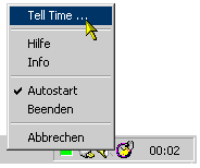 Klicken Sie das Icon dagegen mit der rechten Maustaste, so öffnet sich das Kontextmenü von TellTime. Hier haben Sie nun unter anderem die Möglichkeit, das Tool fest für einen automatischen Start vorzusehen (oder diese Option wieder aufzuheben), das Programm ggf. direkt zu beenden, sowie Zugang zu Zusatzinfos und (diesem) Hilfetext.