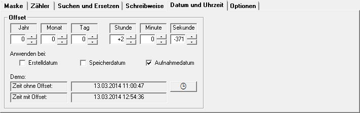 Bei dem Punkt Anwenden bei: stellen Sie zudem ein, bei welcher Gattung von Platzhaltern der Offset einbezogen werden soll: Erstelldatum, Speicherdatum und Aufnahmedatum.