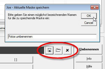 Joe bietet Ihnen zudem die Möglichkeit, Ihre Umbenennungsmasken und die dazugehörigen Parameter wie etwa Zähler und Ersetzungen etc. für eine spätere Wiederverwendung zu speichern. Das geschieht zum einen automatisch: Nach jedem Neustart des Tools finden Sie die gleichen Einstellungen wie beim letzten Beenden wieder (sofern dies nicht auf der Registerkarte Optionen deaktiviert wurde).